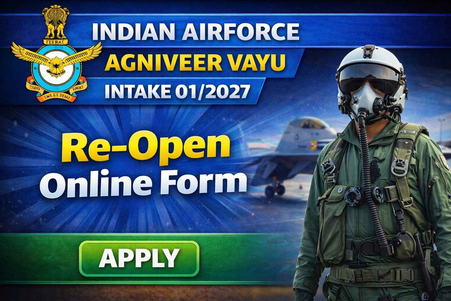 The Indian Air Force (IAF) has reopened the online application window for Agniveer Vayu Intake 01/2027 under the Agnipath Scheme. This is a short, time-sensitive opportunity for unmarried male and female candidates to join as Agniveervayu (Science and Other than Science streams) for a 4-year engagement period.