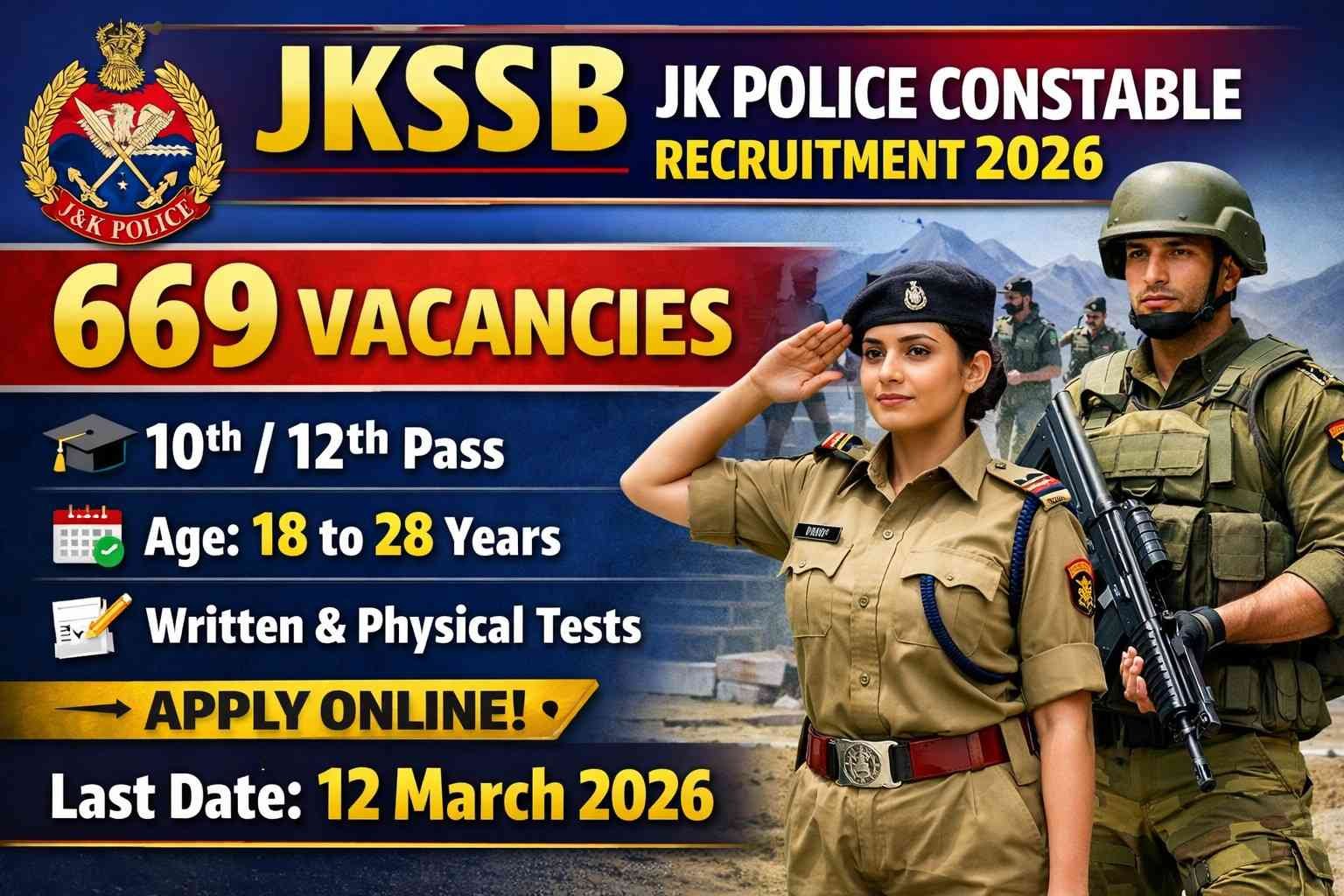 Jammu and Kashmir Services Selection Board (JKSSB) has released notifications for JK Police Constable Recruitment 2026 (Advt. No. 14 & 15 of 2025) to fill posts in J&K Police (Home Department). This is a major opportunity for 10th/12th pass candidates to join as Constable in Armed/IRP/SDRF, Telecommunication, and Photographer roles.